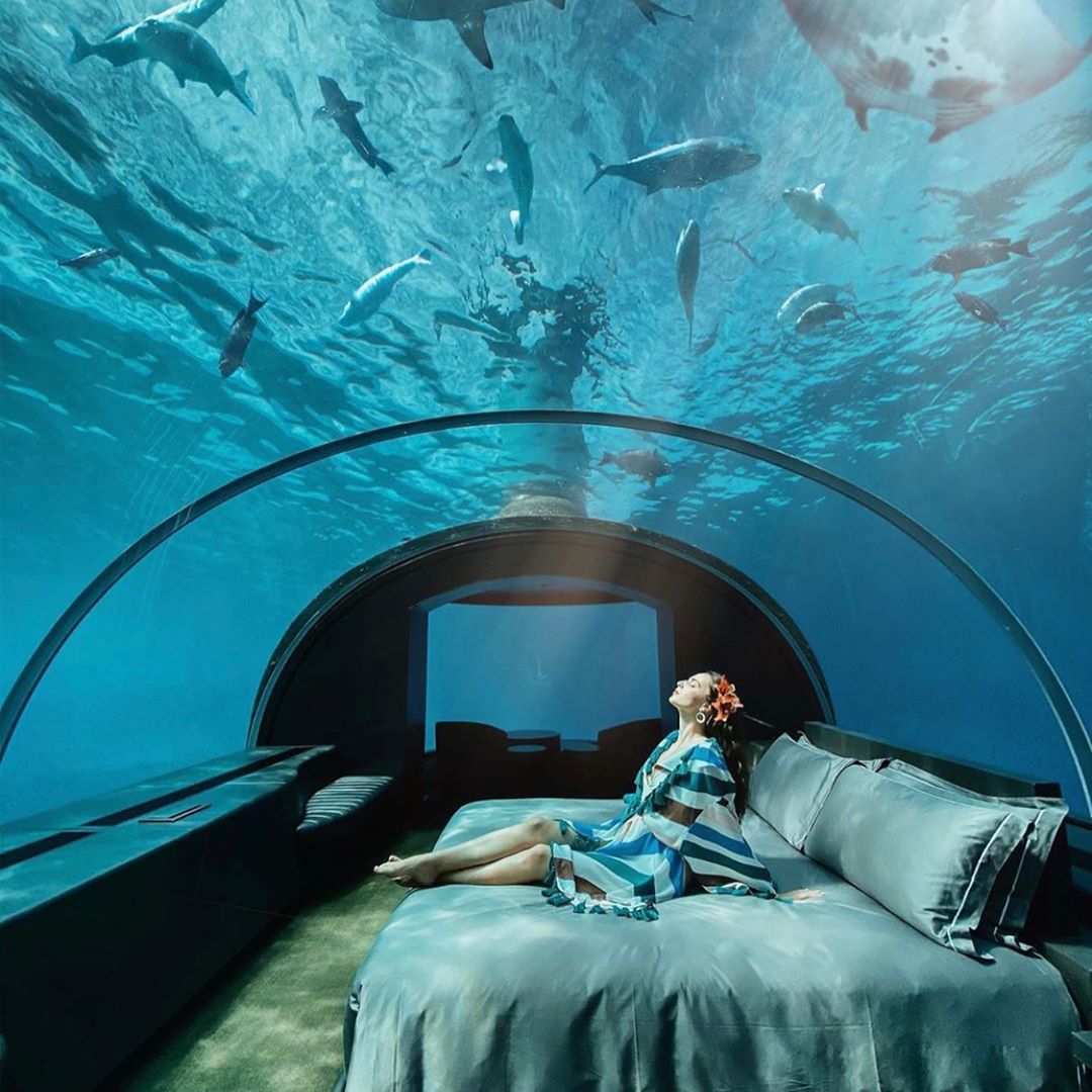 Es posible que ya haya visto fotos del excepcional restaurante submarino de Hurawalhi, que es el restaurante submarino totalmente acristalado más grande del mundo. Aunque este hotel no tiene ningún alojamiento bajo el agua, por lo que no podrá dormir realmente con los peces, vivirá una experiencia completamente única al comer rodeado de ellos.