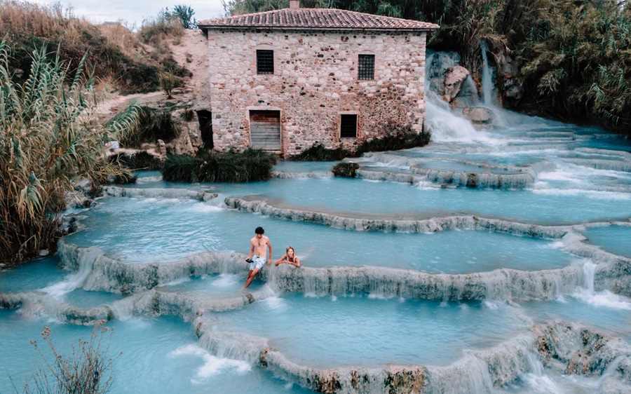 Las cascadas celestes y las cuencas calcáreas al aire libre crean un teatro de agua tibia donde el tiempo corre distinto, entre viñedos y pueblos toscanos. Hay dos maneras de vivirlo: el complejo con servicios completos para quien busca comodidad total, o las Cascate del Mulino, gratuitas y siempre fotogénicas, para un baño espontáneo con ambientazo local.
